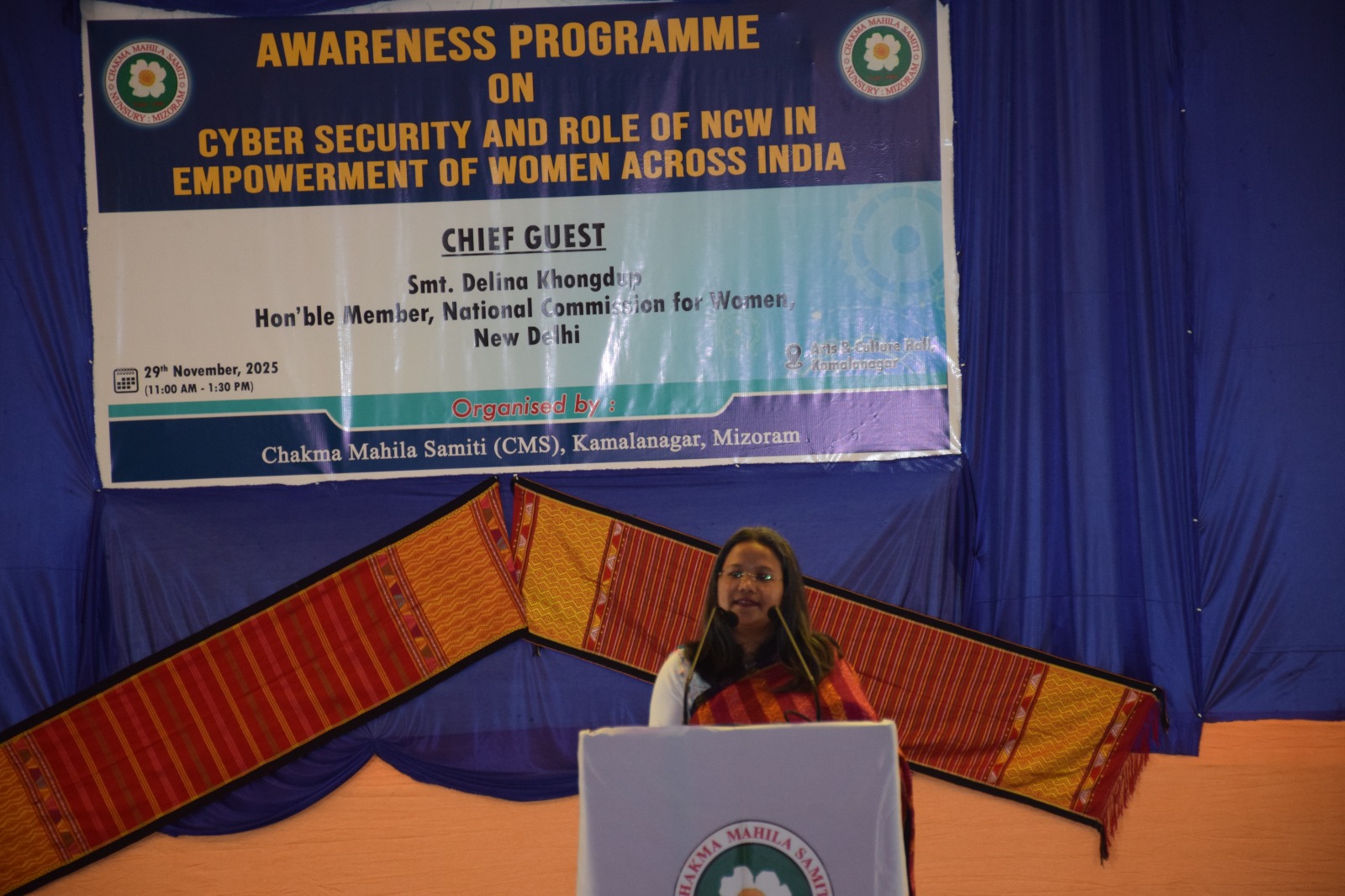 Kamalanagar, 01 December 2025: Smt. Delina Khongdup, Hon’ble Member, National Commission for Women (NCW), New Delhi, visited Kamalanagar on Saturday (29 November 2025) as part of her official tour to Mizoram. During the visit, she attended an awareness programme on β€œCyber Security and Role of NCW in Empowerment of Women” as Chief Guest. The programme was organised by the Chakma Mahila Samiti (CMS).